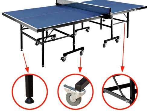 Esta mesa está fabricada con tablero DMF azul de 15 mm que proporciona el bote reglamentario de la pelota y está reforzada con marco de acero de 30×15 mm en todo su contorno para dotar al tablero de una mayor solidez.
